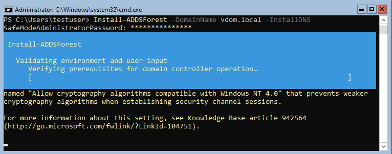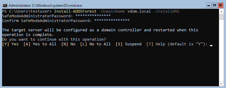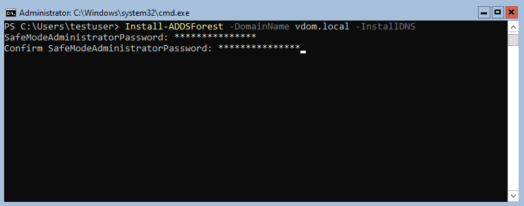 To create a new forest and domain named vdom.local, type Install-ADDSForest -DomainName vdom.local -InstallDNS and press “Enter”.