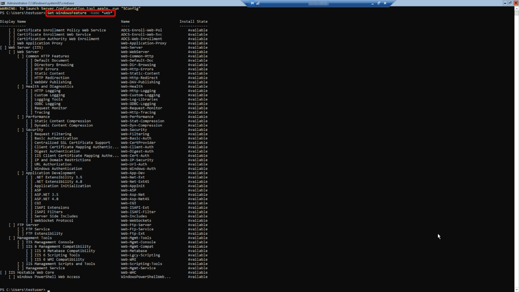 To check available services, enter Get-WindowsFeature -Name *web*