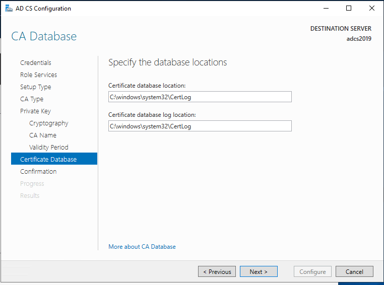 12. On the CA Database page, specify the locations for the database and database log files. Click Next.