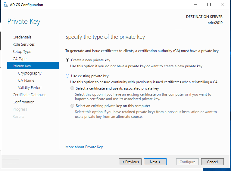 - On the Private Key page, choose between Create a new private key or Use existing private key. Click Next.