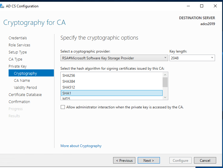 - Select the default cryptographic provider as RSA#Microsoft Software Key Storage Provider.