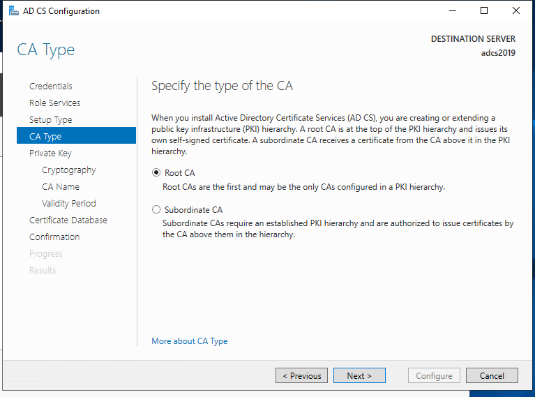 - On the CA Type page, Select Root CA if this is the first CA in your environment or Subordinate CA if you have an established PKI already, Click Next.