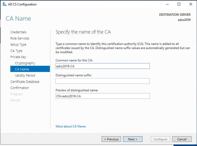 - On the CA Name page, specify the name of your CA in the Common name for this CA text box.