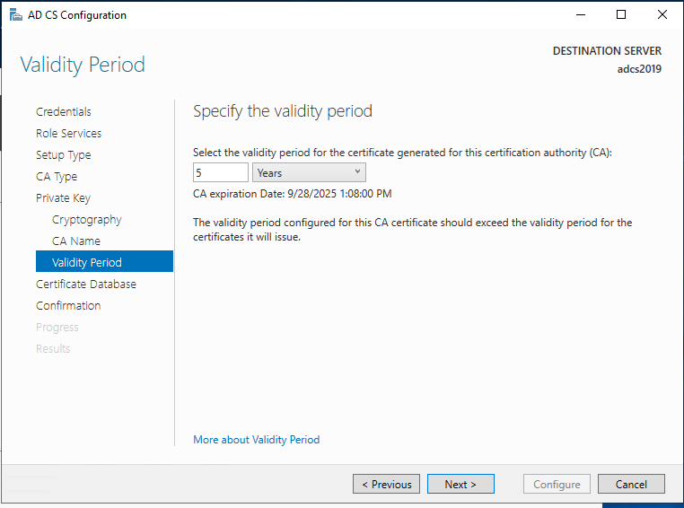 - On the Validity Period page, select the number of years for the certificate to be valid.