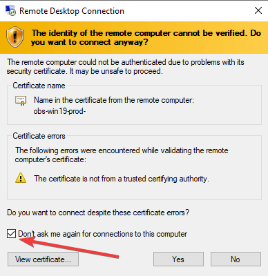 - After starting the connection, a window with a certificate will appear; in it, you must select the Always trust certificate item and click OK