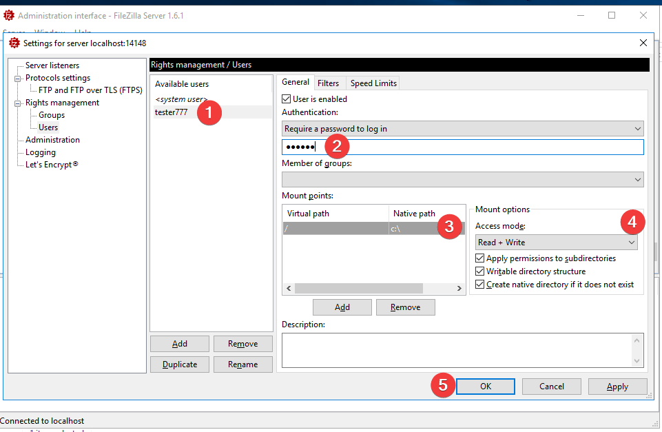 - Enter username (1), password (2), grant access to the required local folders (3), set user rights (4), and click OK (5)