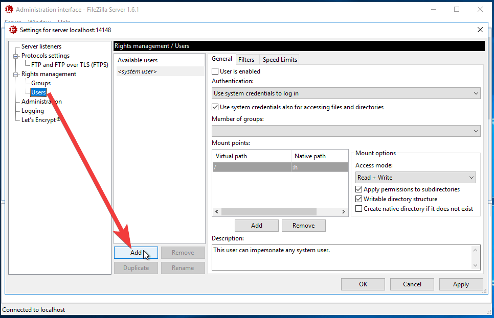 - To set up local users and give them access to the directories locally on your server, you need to select Rights management->Users
