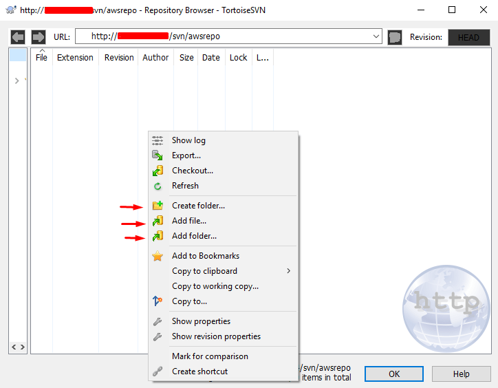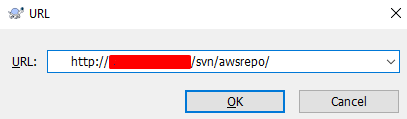 After the client is installed, run “TortoiseSVN Repository Browser”. In the opened window, enter the link http://ip/svn/awsrepo (where in the link instead of “ip” type the real ip of the virtual machine on AWS) and click “OK”: