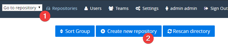 - To create the repository, go to the “Repositories” tab (1) and click the “Create new repository” button (2)