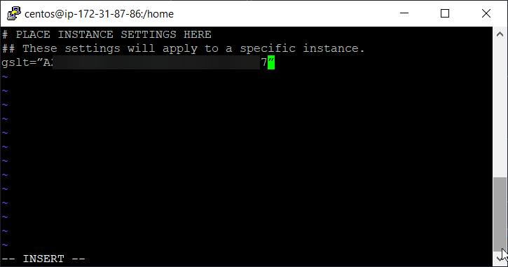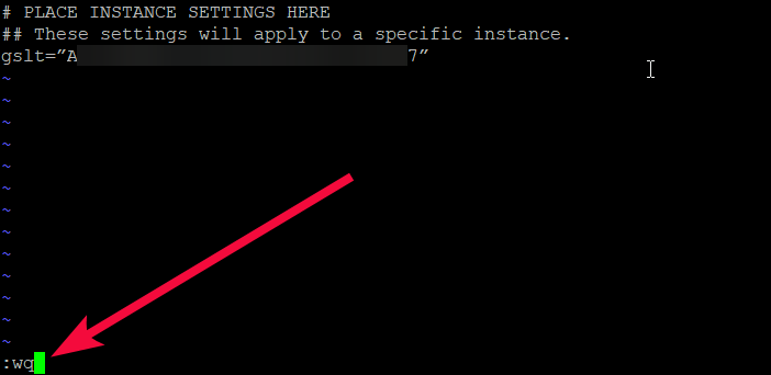 The file editor will open. Press Insert on the keyboard. Add parameter to the end of file gslt=”Token” and paste the generated token from section 2 in quotes. In order to go to the desired line, use the arrows on the keyboard. To paste the copied text, use the right mouse button.