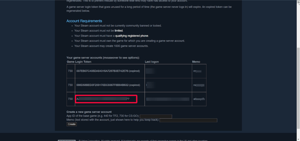 Enter 730 in the app ID field, enter the text to further identify the token in the Memo field, and then click “Create”.