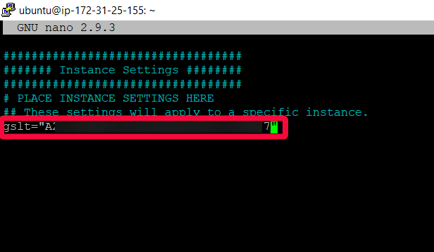 The file editor will open. Add parameter to the end of file gslt=”Token” and paste the generated token from section 2 in quotes. In order to go to the desired line, use the arrows on the keyboard. To paste the copied text, use the right mouse button.