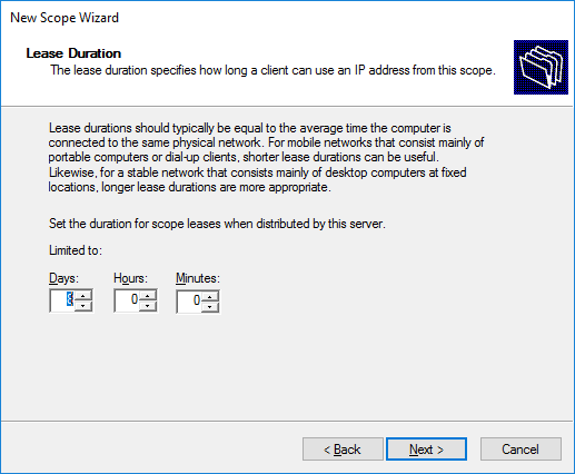 - Next, it is necessary to specify the lease term for the domain addresses issued by this server and click “Next”.