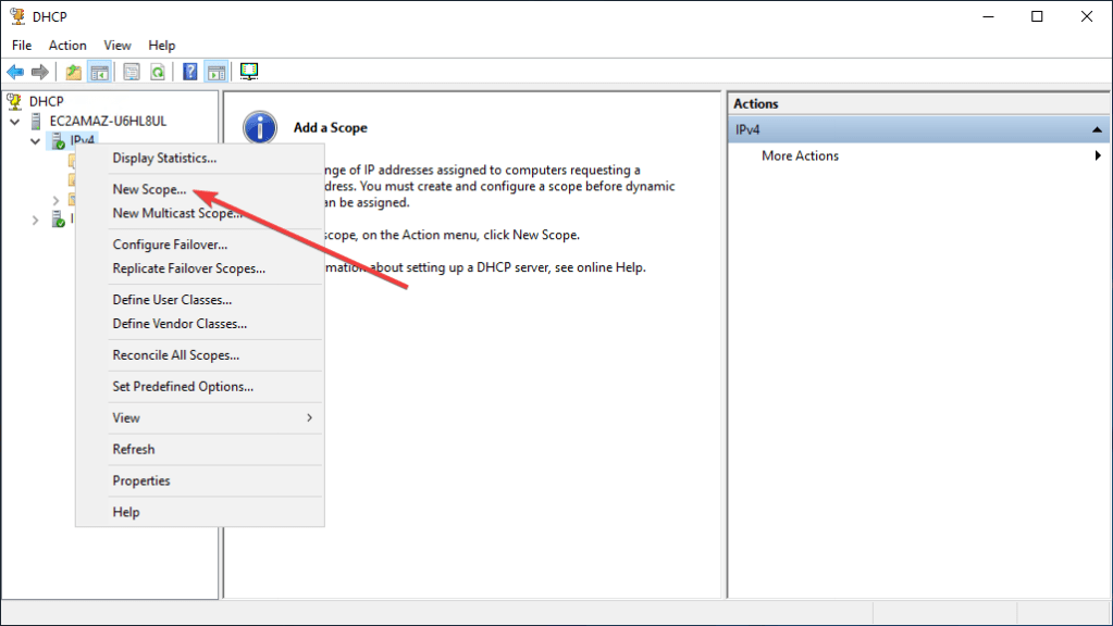 - Expand the server by clicking on it LMB and on IPv4 click RMB and select “New Scope” from the context menu.