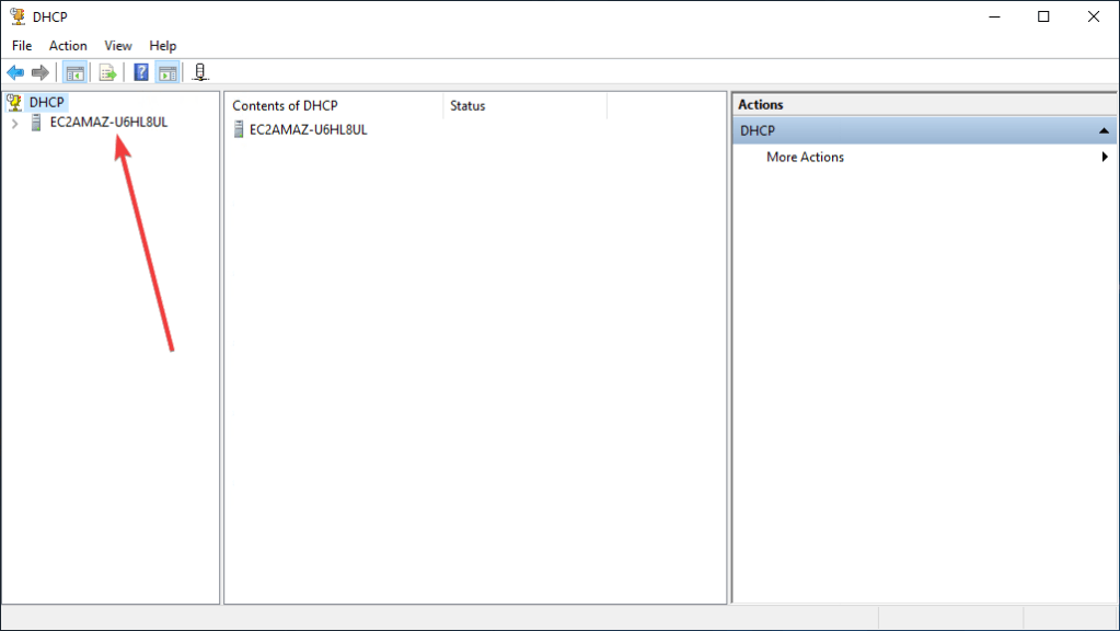 - Run the DHCP shortcut on the Windows desktop. As you can see in DHCP, the only server is “EC2AMAZ-U6HL8UL.”: