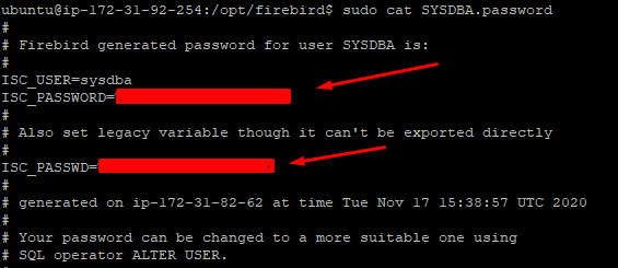 - Now you should write down (copy) the password from the ISC_PASSWORD or ISC_PASSWD field (they are the same). It is necessary to connect to the database.