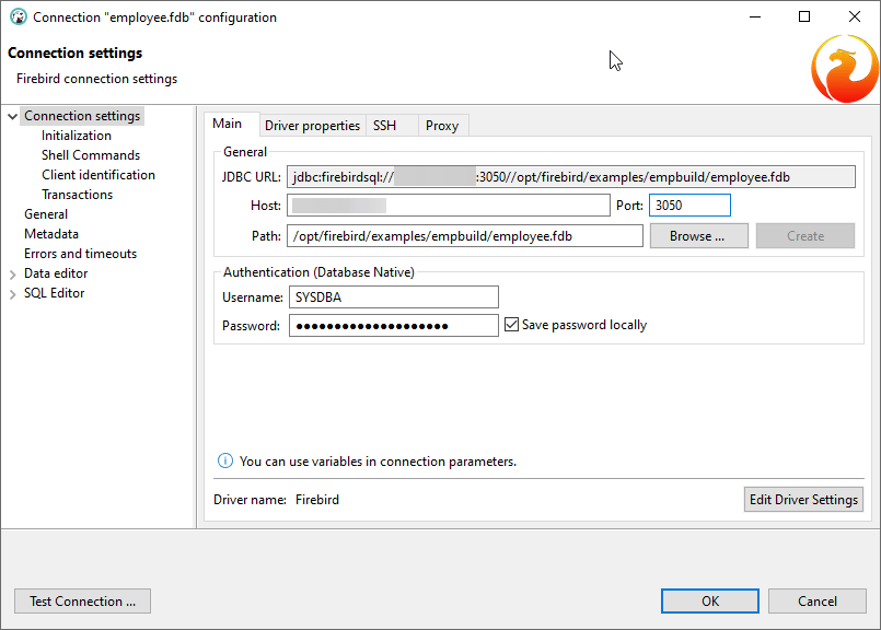 - In the “Path” field specify the path to the database located on the VM. By default, The test Database will be created along the path: /opt/firebird/examples/empbuild/employee.fdb