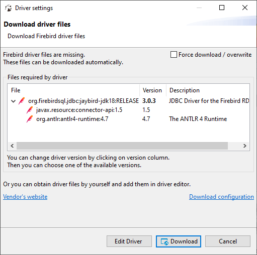 - While connecting, the window with the driver files installation may appear. Click “Download”, after that the connection to the database will be continued.