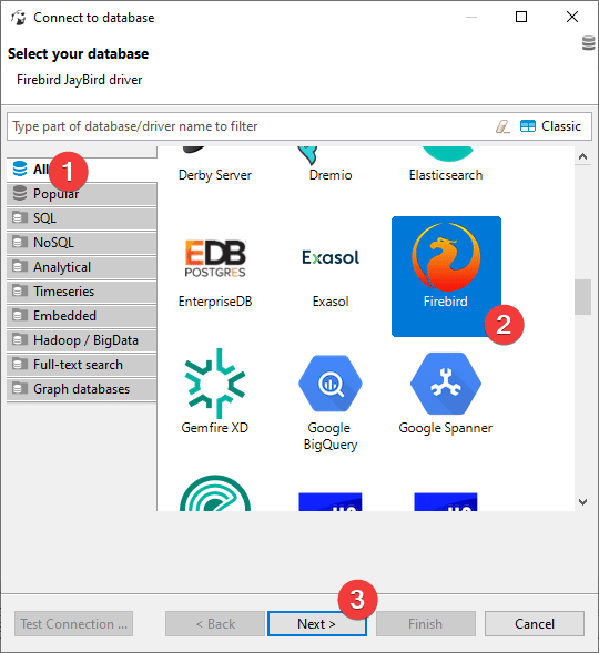 - In the list that appeared find and select “Firebird”, then click the “Next” button