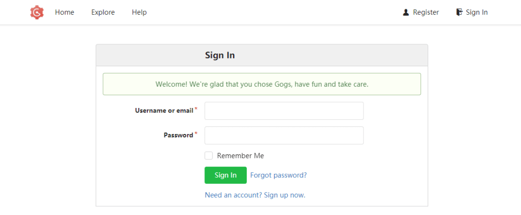 Click on the “Install Gogs” button at the bottom of the page to complete the configuration settings, then the “Sign in” page will open: