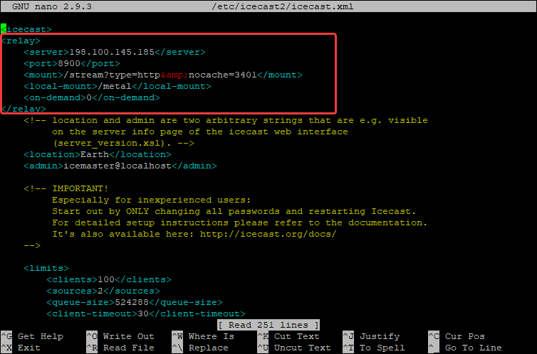 10. To add a test radio station, add the following lines inside the <icecast> tag (but not inside other tags).