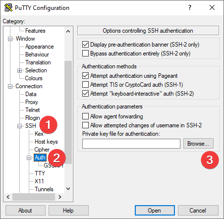 - In the “Auth” section, click “Browse” and specify the path to the .ppk file you received earlier.