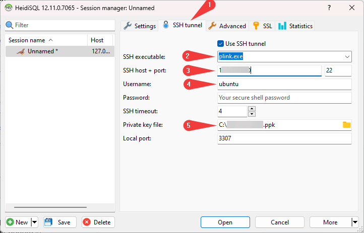 - Go to the appeared SSH tunnel tab (1), select the plink.exe in the SSH executable field (2), enter the address of the virtual machine in the SSH host field (3), enter ubuntu in the Username field (4), in the Private Key file field, specify the path to the key that was created in step 1 (5)