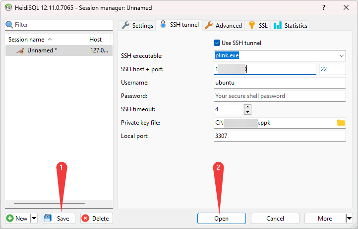 - Click Save (1) and then click Open (2) to connect to DBMS