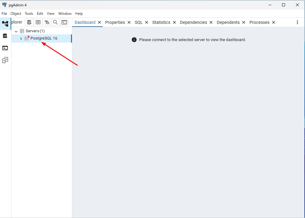 3.1. In the pgAdmin dashboard, click on the server named “PostgreSQL 16”.