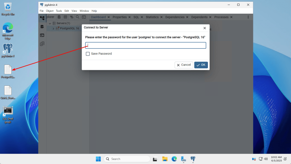 3.2. Enter the password provided in the PostgreSQL_Credentials file located on the desktop.