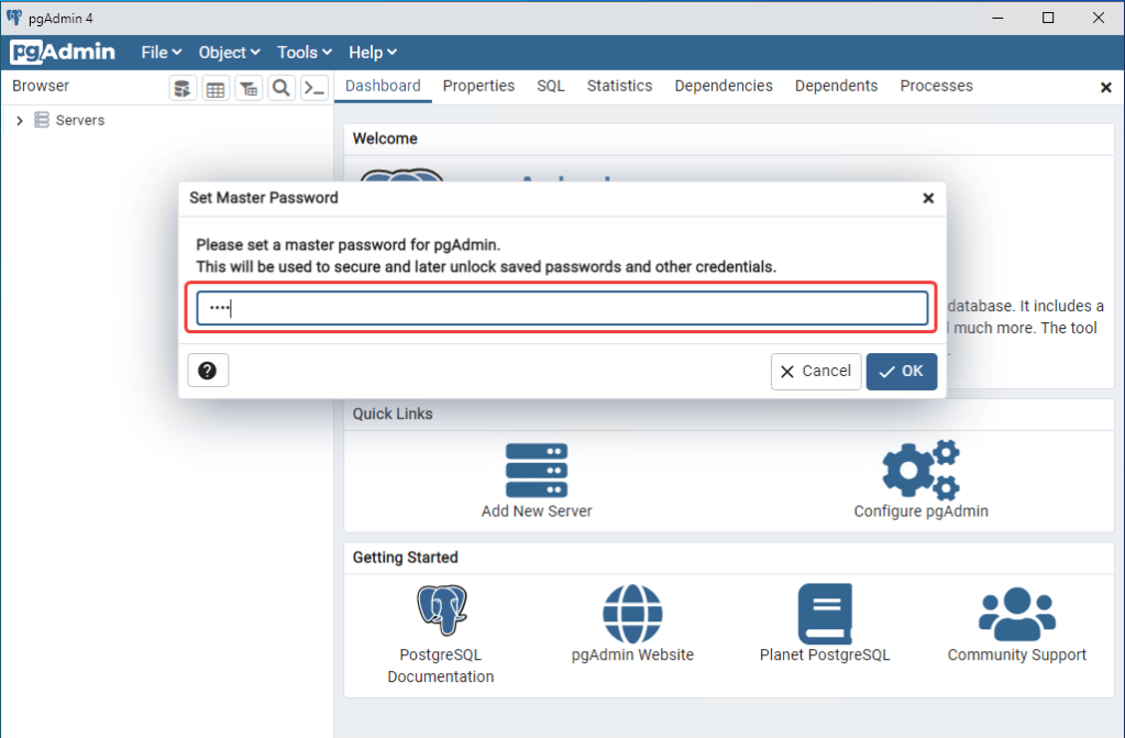 If prompted, set a master password to secure your saved connections. Click OK to proceed.