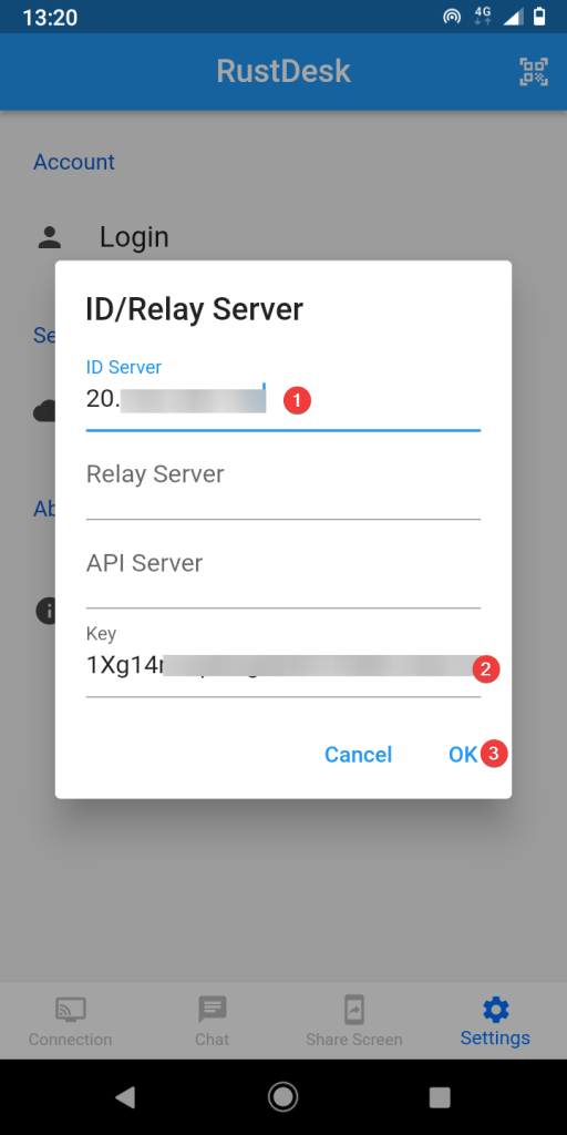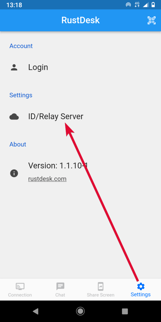 - Open RustDesk and go to “Settings ⇒ ID/Relay Server”