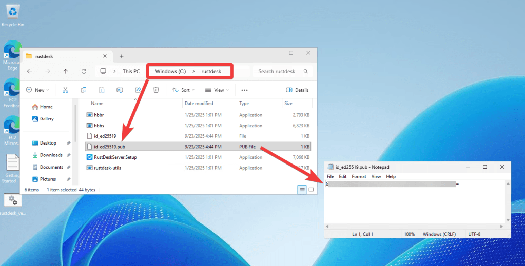 - Open and save the secret key from C:\rustdesk\id*****.pub file on the VM