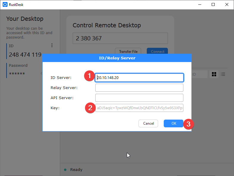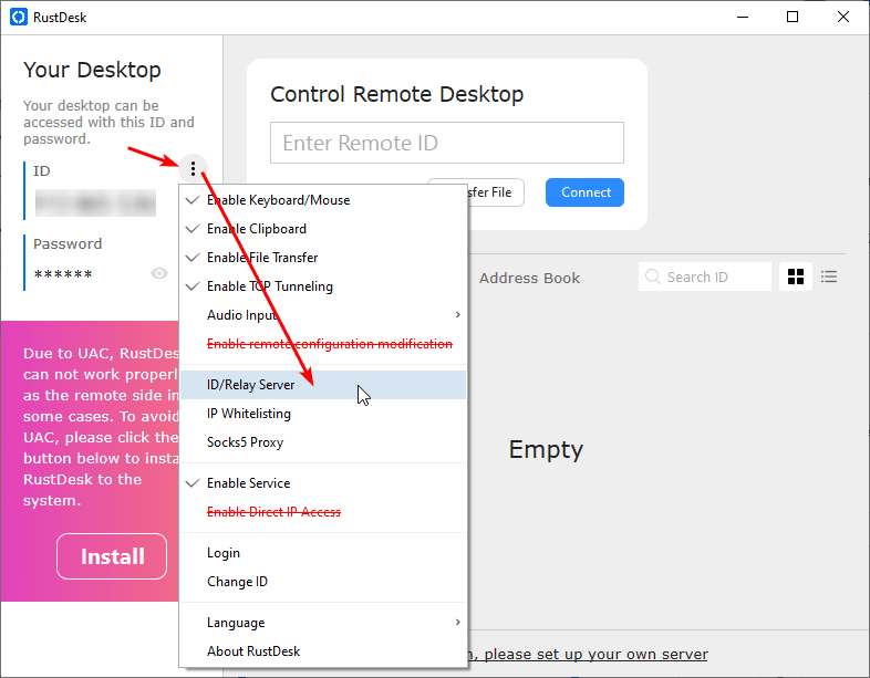 - Open RustDesk and click ‘ID/Relay Server’