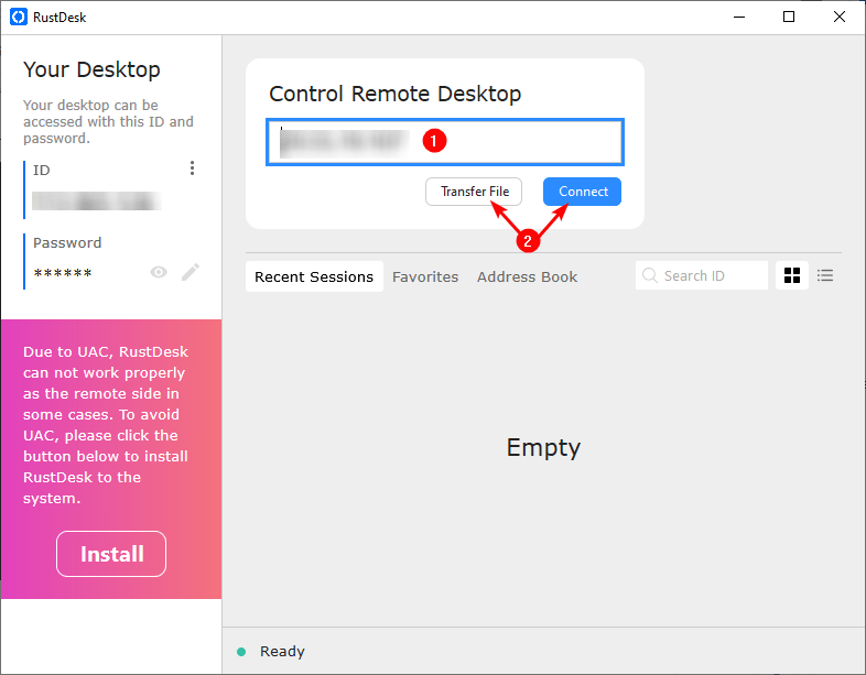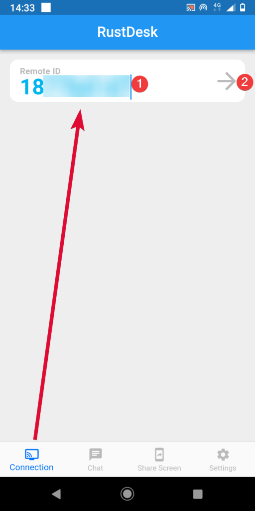 - To connect to the remote device, go tothe ‘Connection’ tab, enter the remote user ID (1), and tap the arrow (2)