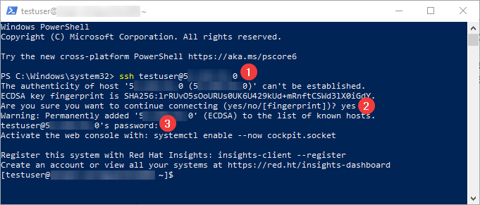 In the Windows 10 operating system (starting with version 1809 ), an OpenSSH client is available, with which you can connect to Linux servers via SSH. If Windows 10 is suitable and the OpenSSH client is installed, you can start connecting via SSH. To do this, launch a standard Windows command prompt and enter the command “ssh user@*vm_ip*” (1), where “user” is the username that was specified while creating the virtual machine and “*vm_ip*” is the VM IP address.