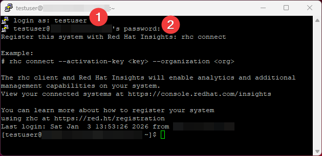 In the opened console you will need to enter a username (1) and password (2) that were specified while the VM was being created (you’ll not see the password in the console while entering it).