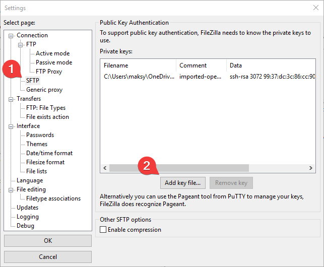 - Go to sftp, click add key file, select file which you have saved before with .pem extension and click Ok