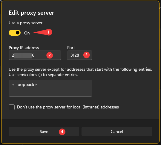 - Turn on the Use proxy server (1), enter the IP address of your VM in the Proxy IP address field (2), and in the Port field specify 3128 (3). Then click the Save button (4)