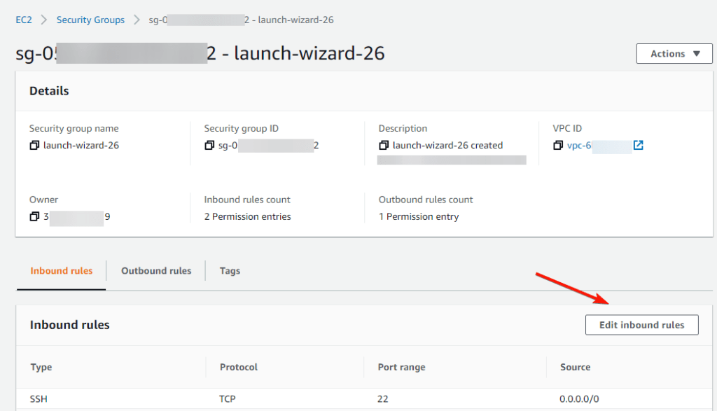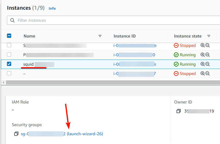- To access the proxy server, you must specify a list of IP addresses in the Security Group. To do this, select your Instance, go to the “Security” section and click on the security group.