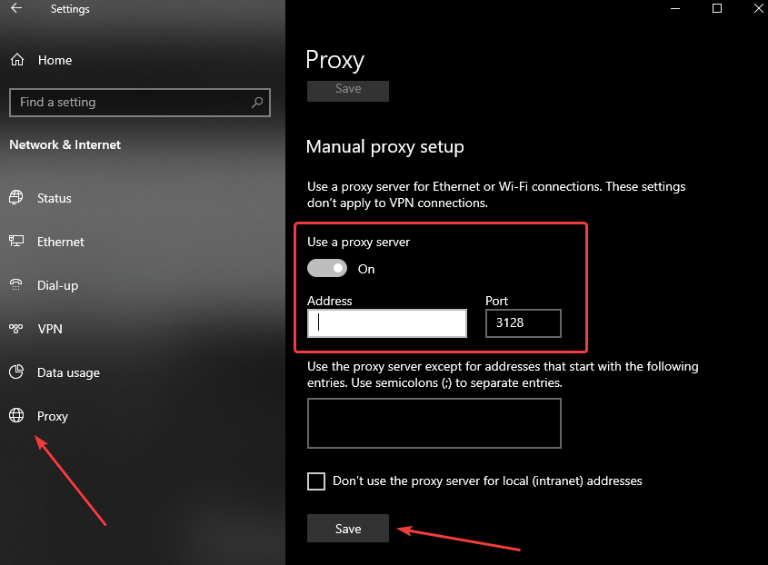 - In the Address field, enter the address of the VM, and in the Port field, specify 3128. Then click the Save button.