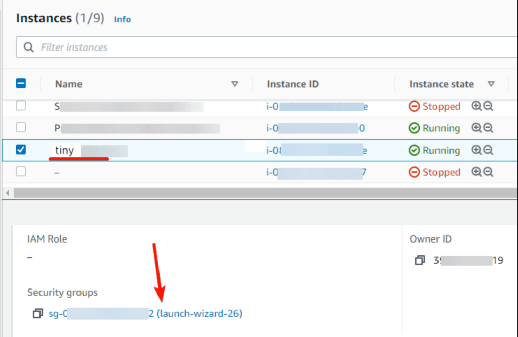 - To access the proxy server, you must specify a list of IP addresses in the Security Group. To do this, select your Instance, go to the “Security” section and click on the security group.