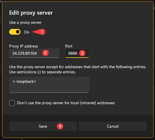 - Turn on the Use proxy server (1), enter the IP address of your VM in the Proxy IP address field (2), and in the Port field specify 8888 (3). Then click the Save button (4)