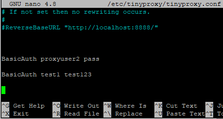 > cat /etc/tinyproxy/credentials - To change a user, or add a new one, you should open the configuration file and enter the data in the form “BasicAuth login password”. To do this, enter the following command: