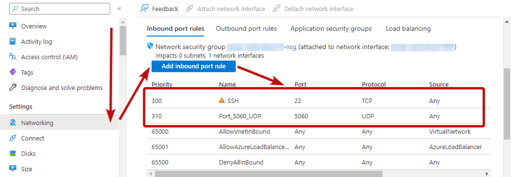 - To work, you must open ports TCP 22 and UDP 5060 in the network properties in the Azure firewall.