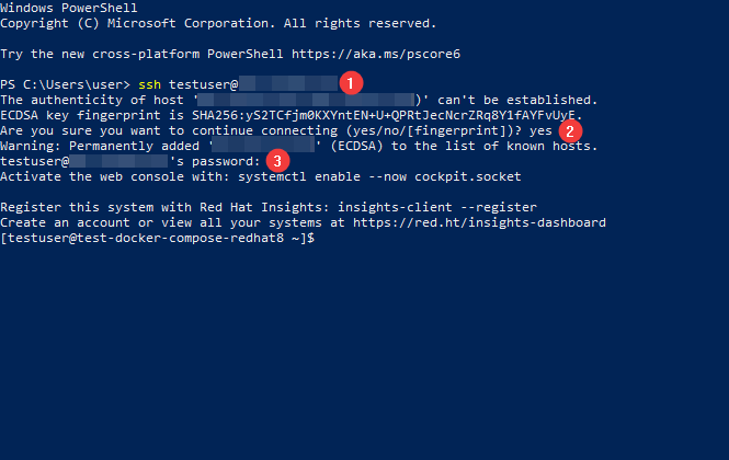 In the Windows operating system (starting with version 1809), an OpenSSH client is available, with which you can connect to Linux servers via SSH. To do this, launch a normal Windows command prompt and enter the command “ssh user@*vm_ip*” (1), where “user” is the username that was specified while creating the virtual machine and “*vm_ip*” is the VM IP address.