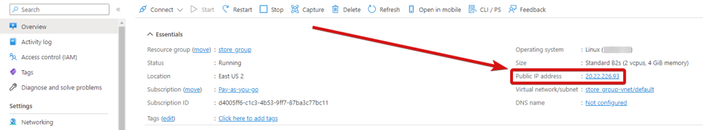 - To start the server, run the VM through Azure Portal. You need to know your IP address. In the virtual machine, select “Overview” and the “Public IP Address” field will have the IP.