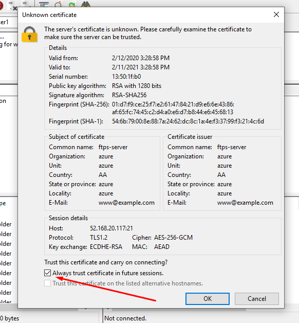 After starting the connection, a window with a certificate will appear, there you must check the box <Always trust certificate> and click <OK>.
